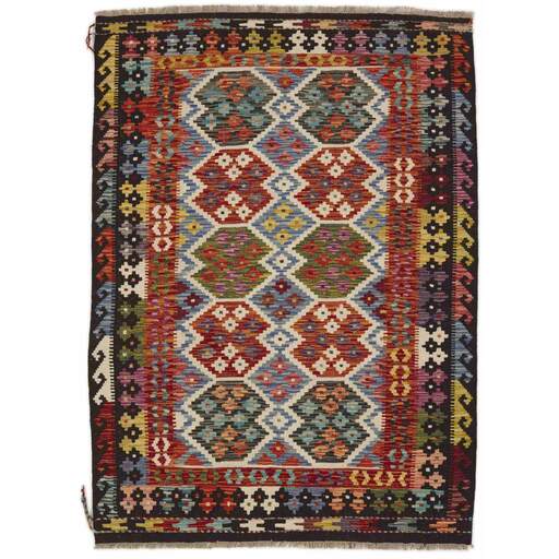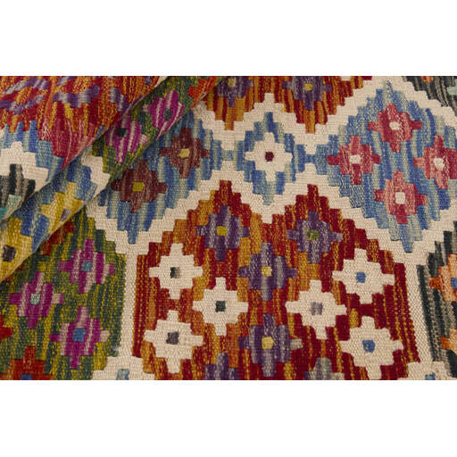 Afghan Kelim rugs are hand woven by Turkmens in northern Afghanistan. Kelim is the name of a common Persian weave, but also of the technology used in the production. Kelims are primarily produced by nomads and are pile-less rugs, which are also used for bags, as wall decoration, or as curtains for tents. A natural colour scale with geometrical symbols and octagons is used.