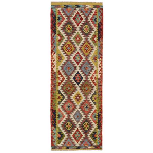 Afghan Kelim rugs are hand woven by Turkmens in northern Afghanistan. Kelim is the name of a common Persian weave, but also of the technology used in the production. Kelims are primarily produced by nomads and are pile-less rugs, which are also used for bags, as wall decoration, or as curtains for tents. A natural colour scale with geometrical symbols and octagons is used.