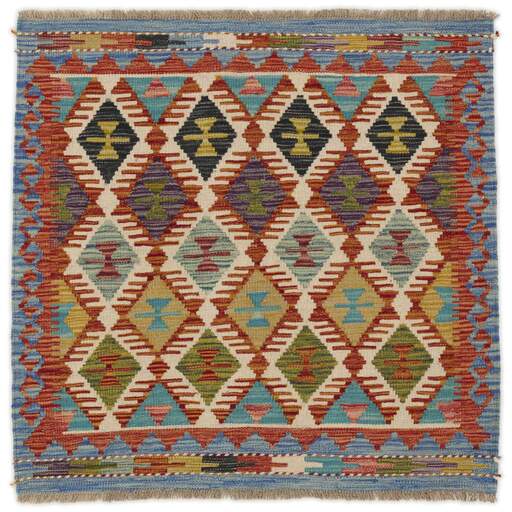 Afghan Kelim rugs are hand woven by Turkmens in northern Afghanistan. Kelim is the name of a common Persian weave, but also of the technology used in the production. Kelims are primarily produced by nomads and are pile-less rugs, which are also used for bags, as wall decoration, or as curtains for tents. A natural colour scale with geometrical symbols and octagons is used.