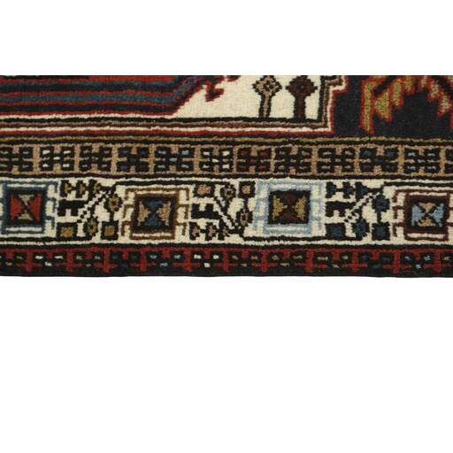 Ardebil and Meshkin (or Meshkinshahr) are situated in East Azerbaijan, east of Tabriz. Ardebil is the biggest and most important of the two cities, and it was home to the Safavaids, a royal family in 17th century Iran. The Safavid mosque and mausoleum complex is located in the city centre. The two 1542 rugs known as the Ardebil rugs, now shared between London and California, were originally placed in the mosque. The rugs produced in Ardebil and Meshkin today are heavily influenced by impressions from other parts of Azerbaijan; by the village rugs covered in geometrical patterns, and by the Tabriz rugs, with their simple patterns and medallions on a Herati base, which provides a beautiful contrast to the calm blue, red, or cream coloured base. Wool and cotton is used for the warp and weft, while the pile is generally wool, although there is a significant production of rugs with mixed silk/wool piles.