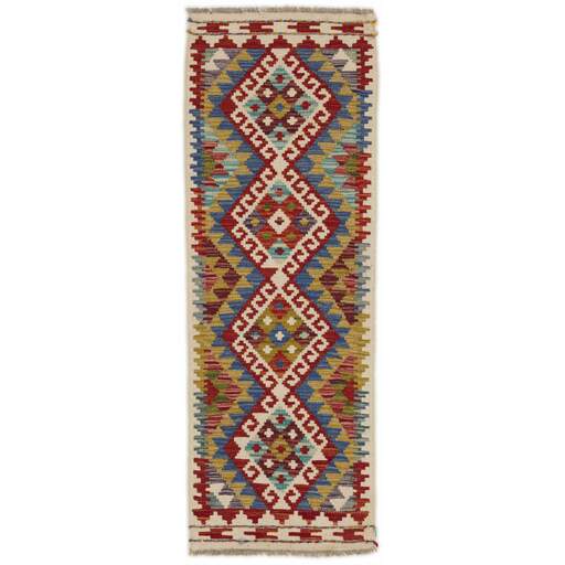 Afghan Kelim rugs are hand woven by Turkmens in northern Afghanistan. Kelim is the name of a common Persian weave, but also of the technology used in the production. Kelims are primarily produced by nomads and are pile-less rugs, which are also used for bags, as wall decoration, or as curtains for tents. A natural colour scale with geometrical symbols and octagons is used.