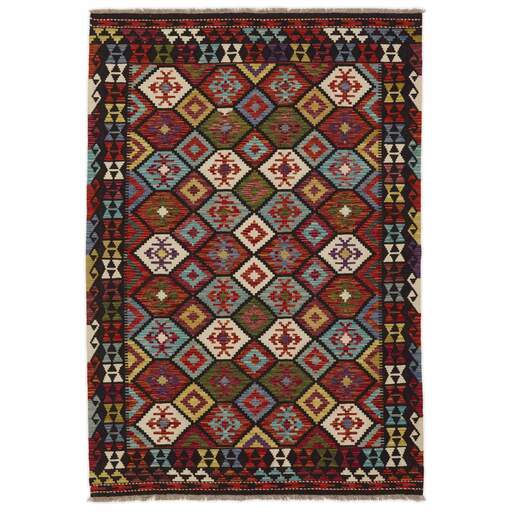 Afghan Kelim rugs are hand woven by Turkmens in northern Afghanistan. Kelim is the name of a common Persian weave, but also of the technology used in the production. Kelims are primarily produced by nomads and are pile-less rugs, which are also used for bags, as wall decoration, or as curtains for tents. A natural colour scale with geometrical symbols and octagons is used.