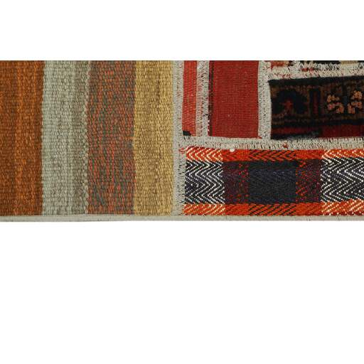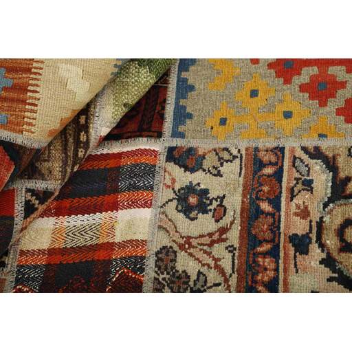Tekkeh Kelims are produced from older Persian Kelims that have been cut into smaller pieces, sewn together, and given a back cover. Tekkeh means piece, so Tekkeh Kelim means a patchwork rug where many pieces have been sewn together. Tekkeh Kelims are available in many sizes and have thoroughly unique patterns. The rugs are produced from 20-50 year old Kelims. Kelim rugs are hand woven rugs that are made using a special weaving technique, giving the rugs a thinner, felt-like quality. Tekkeh Kelim is produced of older Persian kelim, cut into smaller pieces, sown together and with a backside applied. Tekkeh is the Persian name for pieces, and Tekkeh kelim is an expression for a patchwork rug, where several pieces are sown together. Tekkeh Kelim is available in many sizes and all pieces has unique patterns. used a special weaving technique, that gives the rug a thinner and felt like quality.