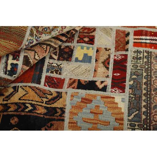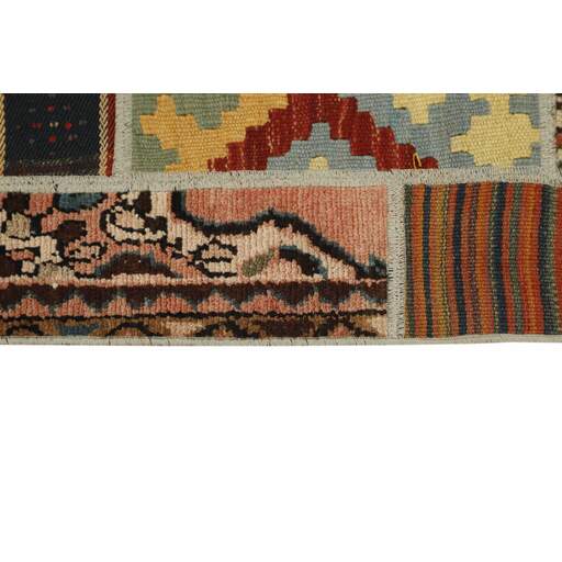 Tekkeh Kelims are produced from older Persian Kelims that have been cut into smaller pieces, sewn together, and given a back cover. Tekkeh means piece, so Tekkeh Kelim means a patchwork rug where many pieces have been sewn together. Tekkeh Kelims are available in many sizes and have thoroughly unique patterns. The rugs are produced from 20-50 year old Kelims. Kelim rugs are hand woven rugs that are made using a special weaving technique, giving the rugs a thinner, felt-like quality. Tekkeh Kelim is produced of older Persian kelim, cut into smaller pieces, sown together and with a backside applied. Tekkeh is the Persian name for pieces, and Tekkeh kelim is an expression for a patchwork rug, where several pieces are sown together. Tekkeh Kelim is available in many sizes and all pieces has unique patterns. used a special weaving technique, that gives the rug a thinner and felt like quality.