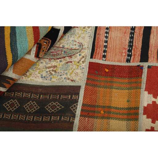 Tekkeh Kelims are produced from older Persian Kelims that have been cut into smaller pieces, sewn together, and given a back cover. Tekkeh means piece, so Tekkeh Kelim means a patchwork rug where many pieces have been sewn together. Tekkeh Kelims are available in many sizes and have thoroughly unique patterns. The rugs are produced from 20-50 year old Kelims. Kelim rugs are hand woven rugs that are made using a special weaving technique, giving the rugs a thinner, felt-like quality. Tekkeh Kelim is produced of older Persian kelim, cut into smaller pieces, sown together and with a backside applied. Tekkeh is the Persian name for pieces, and Tekkeh kelim is an expression for a patchwork rug, where several pieces are sown together. Tekkeh Kelim is available in many sizes and all pieces has unique patterns. used a special weaving technique, that gives the rug a thinner and felt like quality.