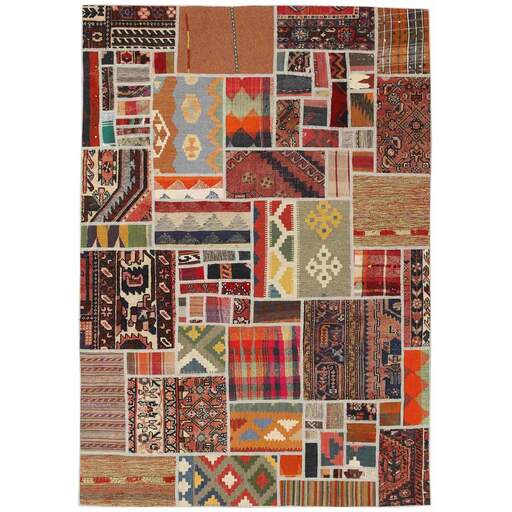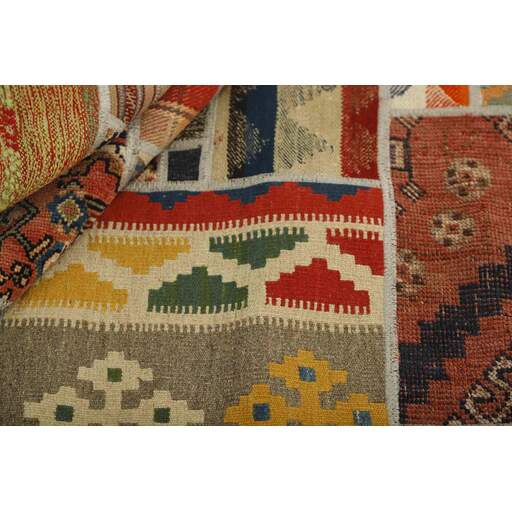 Tekkeh Kelims are produced from older Persian Kelims that have been cut into smaller pieces, sewn together, and given a back cover. Tekkeh means piece, so Tekkeh Kelim means a patchwork rug where many pieces have been sewn together. Tekkeh Kelims are available in many sizes and have thoroughly unique patterns. The rugs are produced from 20-50 year old Kelims. Kelim rugs are hand woven rugs that are made using a special weaving technique, giving the rugs a thinner, felt-like quality. Tekkeh Kelim is produced of older Persian kelim, cut into smaller pieces, sown together and with a backside applied. Tekkeh is the Persian name for pieces, and Tekkeh kelim is an expression for a patchwork rug, where several pieces are sown together. Tekkeh Kelim is available in many sizes and all pieces has unique patterns. used a special weaving technique, that gives the rug a thinner and felt like quality.