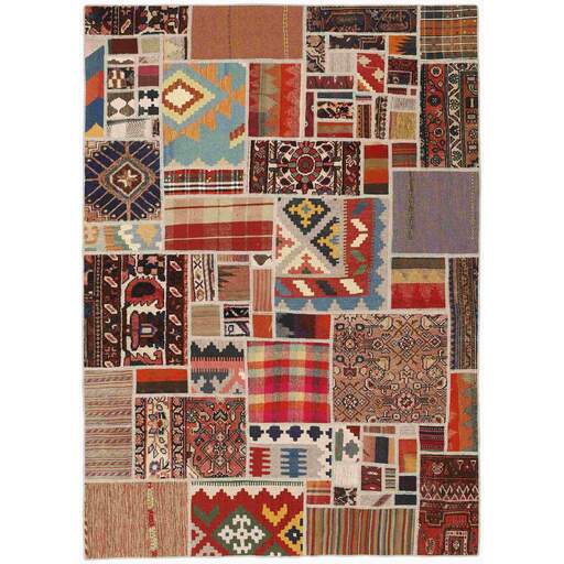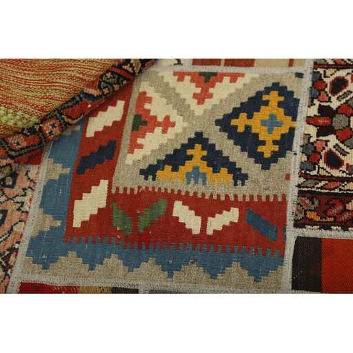 Tekkeh Kelims are produced from older Persian Kelims that have been cut into smaller pieces, sewn together, and given a back cover. Tekkeh means piece, so Tekkeh Kelim means a patchwork rug where many pieces have been sewn together. Tekkeh Kelims are available in many sizes and have thoroughly unique patterns. The rugs are produced from 20-50 year old Kelims. Kelim rugs are hand woven rugs that are made using a special weaving technique, giving the rugs a thinner, felt-like quality. Tekkeh Kelim is produced of older Persian kelim, cut into smaller pieces, sown together and with a backside applied. Tekkeh is the Persian name for pieces, and Tekkeh kelim is an expression for a patchwork rug, where several pieces are sown together. Tekkeh Kelim is available in many sizes and all pieces has unique patterns. used a special weaving technique, that gives the rug a thinner and felt like quality.
