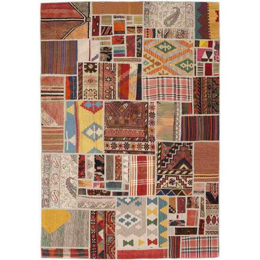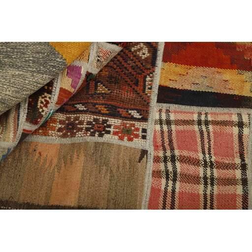 Tekkeh Kelims are produced from older Persian Kelims that have been cut into smaller pieces, sewn together, and given a back cover. Tekkeh means piece, so Tekkeh Kelim means a patchwork rug where many pieces have been sewn together. Tekkeh Kelims are available in many sizes and have thoroughly unique patterns. The rugs are produced from 20-50 year old Kelims. Kelim rugs are hand woven rugs that are made using a special weaving technique, giving the rugs a thinner, felt-like quality. Tekkeh Kelim is produced of older Persian kelim, cut into smaller pieces, sown together and with a backside applied. Tekkeh is the Persian name for pieces, and Tekkeh kelim is an expression for a patchwork rug, where several pieces are sown together. Tekkeh Kelim is available in many sizes and all pieces has unique patterns. used a special weaving technique, that gives the rug a thinner and felt like quality.