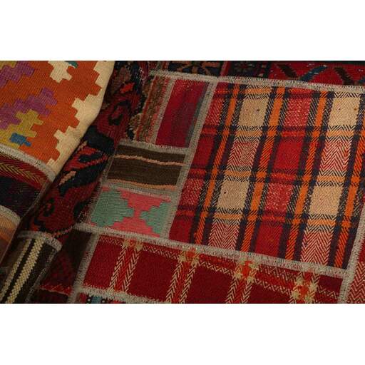 Tekkeh Kelims are produced from older Persian Kelims that have been cut into smaller pieces, sewn together, and given a back cover. Tekkeh means piece, so Tekkeh Kelim means a patchwork rug where many pieces have been sewn together. Tekkeh Kelims are available in many sizes and have thoroughly unique patterns. The rugs are produced from 20-50 year old Kelims. Kelim rugs are hand woven rugs that are made using a special weaving technique, giving the rugs a thinner, felt-like quality. Tekkeh Kelim is produced of older Persian kelim, cut into smaller pieces, sown together and with a backside applied. Tekkeh is the Persian name for pieces, and Tekkeh kelim is an expression for a patchwork rug, where several pieces are sown together. Tekkeh Kelim is available in many sizes and all pieces has unique patterns. used a special weaving technique, that gives the rug a thinner and felt like quality.