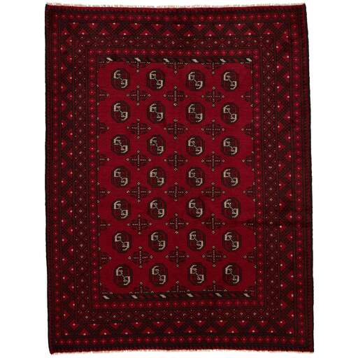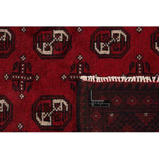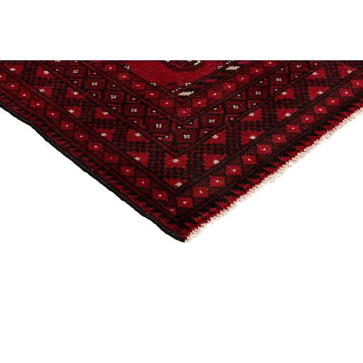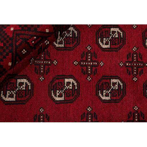 Aktscha rugs are knotted by Turkmens in the Aktscha (Acqcha) district, which is situated in the central part of the Jowzjan Province of northern Afghanistan. The Aktscha rugs are very similar to the Old Afghan (Khal Mohammadi) rugs, but are of a lower quality, as the knot density is lower. The rugs have the same characteristics, with the deep, warm, and fiery red base colour, the relatively high and sturdy pile, the wool base weave, and the use of goat’s and horse’s hair. The Gül (Elephant’s Foot) pattern is the primary pattern of the Aktscha rugs.