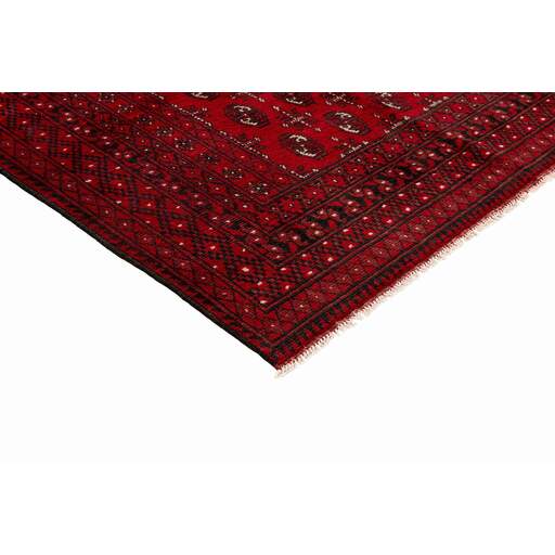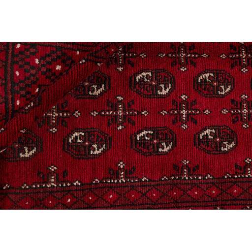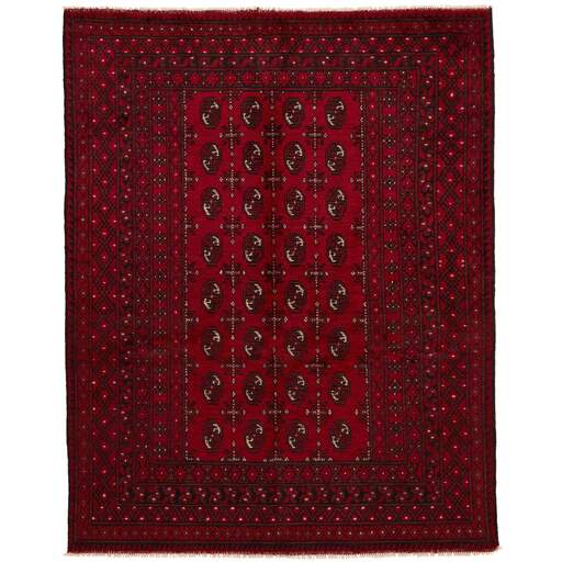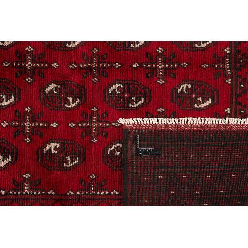 Aktscha rugs are knotted by Turkmens in the Aktscha (Acqcha) district, which is situated in the central part of the Jowzjan Province of northern Afghanistan. The Aktscha rugs are very similar to the Old Afghan (Khal Mohammadi) rugs, but are of a lower quality, as the knot density is lower. The rugs have the same characteristics, with the deep, warm, and fiery red base colour, the relatively high and sturdy pile, the wool base weave, and the use of goat’s and horse’s hair. The Gül (Elephant’s Foot) pattern is the primary pattern of the Aktscha rugs.