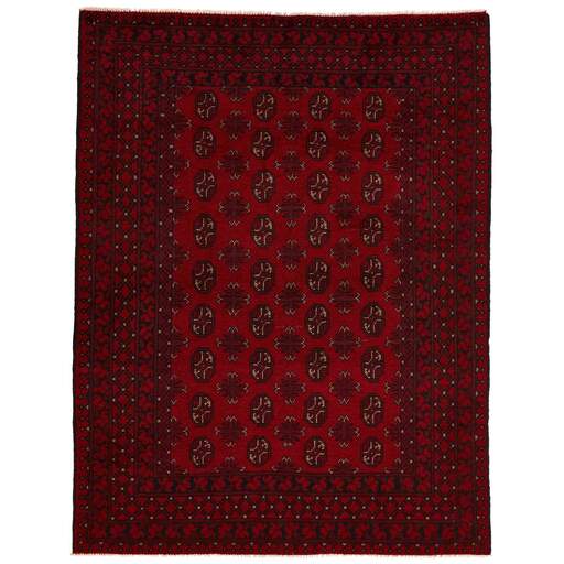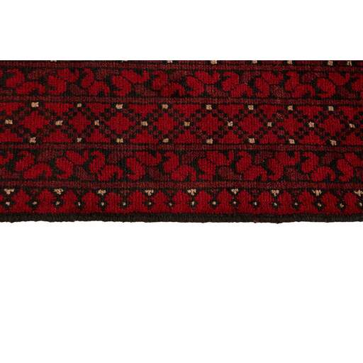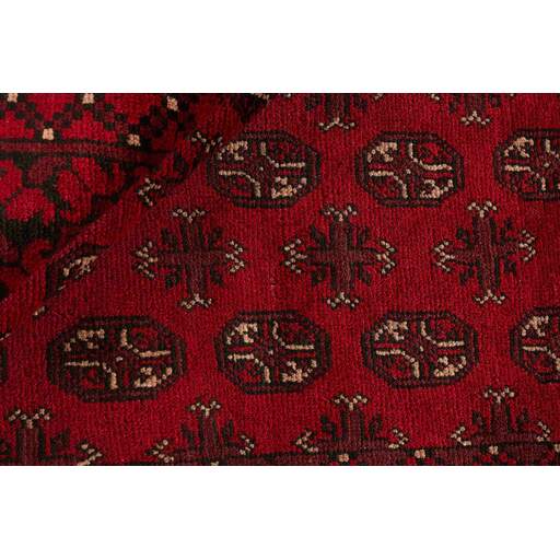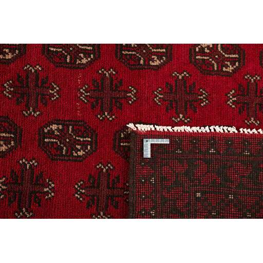 Aktscha rugs are knotted by Turkmens in the Aktscha (Acqcha) district, which is situated in the central part of the Jowzjan Province of northern Afghanistan. The Aktscha rugs are very similar to the Old Afghan (Khal Mohammadi) rugs, but are of a lower quality, as the knot density is lower. The rugs have the same characteristics, with the deep, warm, and fiery red base colour, the relatively high and sturdy pile, the wool base weave, and the use of goat’s and horse’s hair. The Gül (Elephant’s Foot) pattern is the primary pattern of the Aktscha rugs.