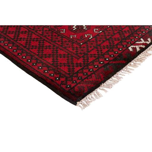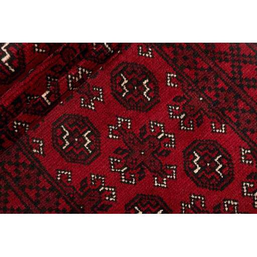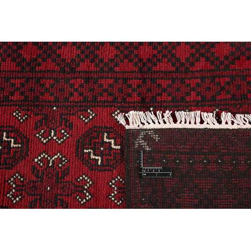 Aktscha rugs are knotted by Turkmens in the Aktscha (Acqcha) district, which is situated in the central part of the Jowzjan Province of northern Afghanistan. The Aktscha rugs are very similar to the Old Afghan (Khal Mohammadi) rugs, but are of a lower quality, as the knot density is lower. The rugs have the same characteristics, with the deep, warm, and fiery red base colour, the relatively high and sturdy pile, the wool base weave, and the use of goat’s and horse’s hair. The Gül (Elephant’s Foot) pattern is the primary pattern of the Aktscha rugs.