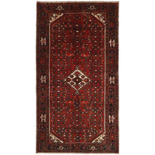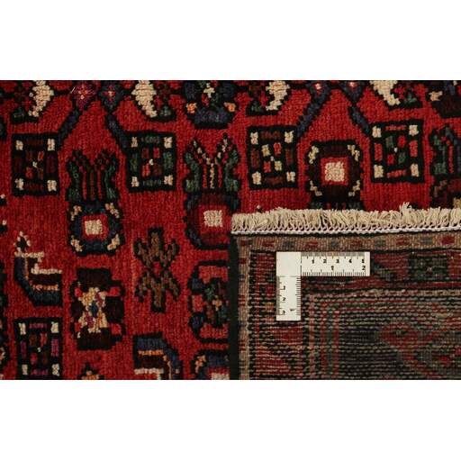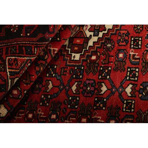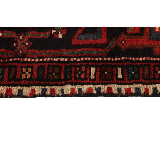 This rug is from the district of Hamadan which is an important centre for the rug trade, as well as the most productive rug production area of Iran. Hamadan is a major city with hundreds of thousands of people. Like Ekbatan, it was a main city of the Achemenian kings. It has an indigenous Jewish population and numerous monuments, of which the most important are the tombs of Esther and Mordicai (central to Jewish pilgrims), and the tomb at Avicenna. Hamadan is a provincial capitol. Two types of rugs are knotted. One is the so-called “city rug”, also known as the Shahrbaff. The production is modern and largely state controlled. The village production, however, is much more important; Hamadan is a market city for many rug producing villages that each has its own pattern. Most prominent are Borchalu, Tuserkman, Memraban, Khamseh, Begardeh, Enjilas, Hosseinabad, and Zandjan. There is a wide range of patterns but the quality is very consistent. The colours are strong, and often plant colours. The patterns are daring, although random, and Hosseinabad and Enjilas in particular are known for through going patterns. The rugs are usually not much bigger than 3 by 2 metres.