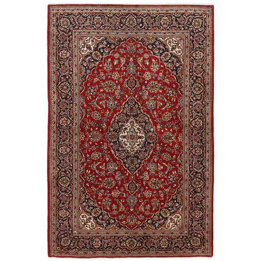 Keshan has always been famed for its handicrafts. The villages lie on the main road between Ghom and Isfahan in central Iran. To the East, the region borders Iran\'s largest desert. Despite the decline of this particular handicraft during the 20th century, many beautiful Keshan rugs are still being produced in accordance with the traditions of the old masters, e.g. decorated with the beautiful medallion patterns or tapestry featuring human and animal motifs. The patterns are most commonly woven around a medallion in the centre of the rug, some of which are repeated in the corners. The other fields are densely decorated with realistic flowers and vines. The main border often features the \"Herati\" motif (an arched leaf), while the secondary borders feature rosettes. Brick red and dark blue are the most common base colours. Keshan is a city of about 300.000 people, situated in the Isfahan province in central Iran. It is rather low lying, and it gets very hot in summer. Traditionally, people have sought to alleviate this by building the houses into the ground. Keshan produces both wool and silk rugs. The first have a cotton warp and weft, the weft being blue. Several qualities are produced, but most Keshan rugs are very finely knotted and all covering. The shape of a Keshan medallion is quite special; it is made by alternating curved lines and right angles. The most common colours are a red field and a blue medallion, with secondary details in other colours. The trimmings of a Keshan rug are also special; the main trimming is normally surrounded by stripes that form a geometrical pattern, usually small blue and red triangles. Keshan rugs come in all sizes. The south-eastern city of Natanez has laid name to image rugs done in the same knotting as Keshans.