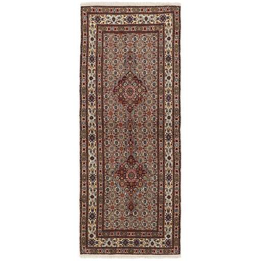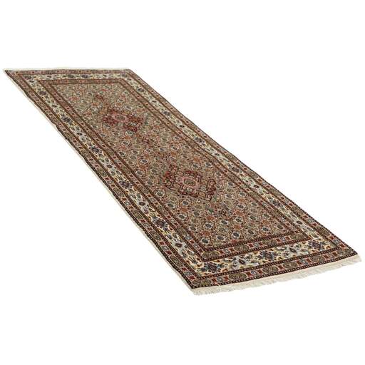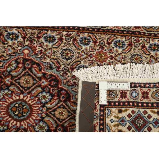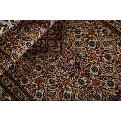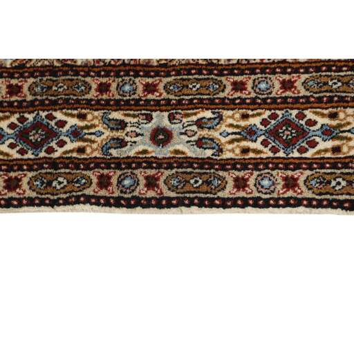 Moud is a small town south of Mashad, in the Khorrasan Province. Rugs from this area are characterised by homogeneity in patterns and quality. Warp and weft are cotton and the pile is wool. The trimmings are a version of the traditional Persian turtle trimming. The rugs are produced in all sizes. Moud rugs are often copied in India, because of their remarkable homogeneity. The characteristic Moud designs are among the most uniform, evenly knotted, and easily recognisable designs of the Khorrasan Province. Moud Mahi are made in a beige, light red, or blue tone, with all-over Mahi patterns or with a star shaped medallion. Mahi means fish, and the Mahi pattern is the most commonly used pattern in genuine Persian rugs. When looking at it closely, you can see a pond encircled by four fish.