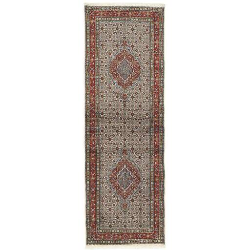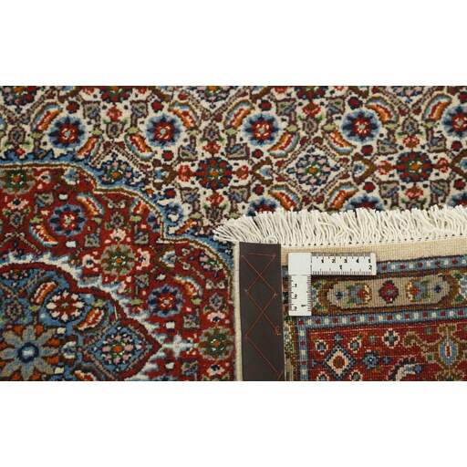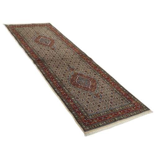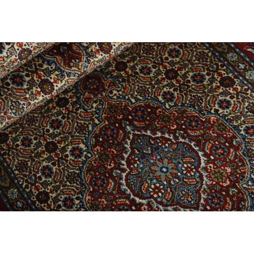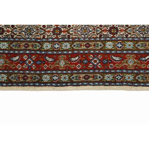 Moud is a small town south of Mashad, in the Khorrasan Province. Rugs from this area are characterised by homogeneity in patterns and quality. Warp and weft are cotton and the pile is wool. The trimmings are a version of the traditional Persian turtle trimming. The rugs are produced in all sizes. Moud rugs are often copied in India, because of their remarkable homogeneity. The characteristic Moud designs are among the most uniform, evenly knotted, and easily recognisable designs of the Khorrasan Province. Moud Mahi are made in a beige, light red, or blue tone, with all-over Mahi patterns or with a star shaped medallion. Mahi means fish, and the Mahi pattern is the most commonly used pattern in genuine Persian rugs. When looking at it closely, you can see a pond encircled by four fish.
