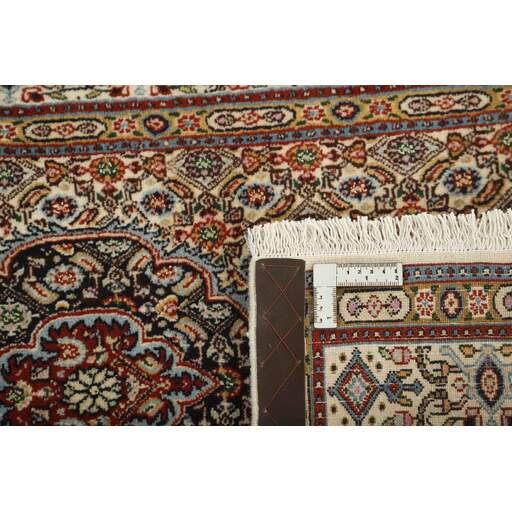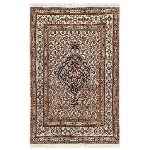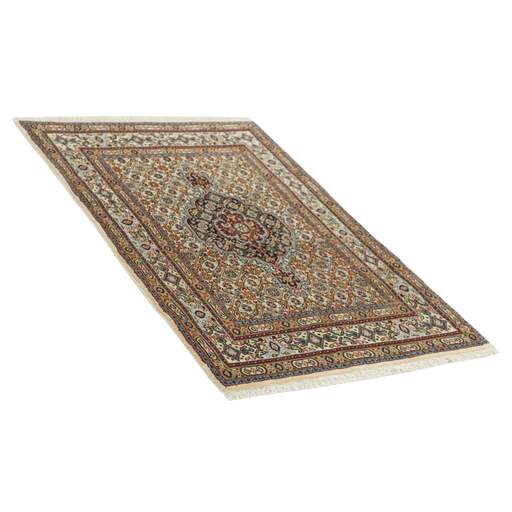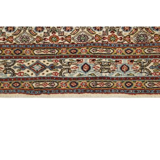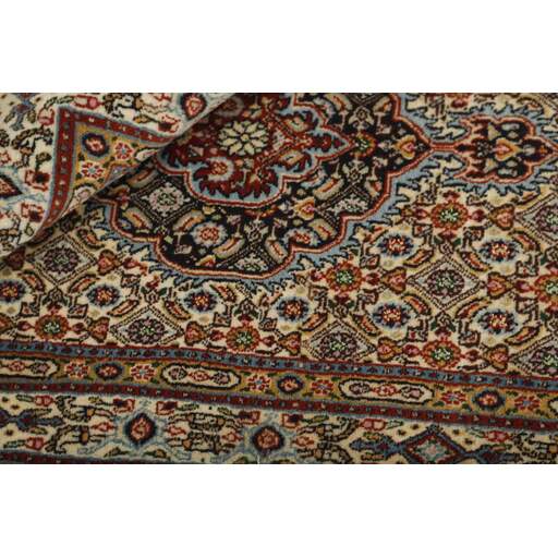 Moud is a small town south of Mashad, in the Khorrasan Province. Rugs from this area are characterised by homogeneity in patterns and quality. Warp and weft are cotton and the pile is wool. The trimmings are a version of the traditional Persian turtle trimming. The rugs are produced in all sizes. Moud rugs are often copied in India, because of their remarkable homogeneity. The characteristic Moud designs are among the most uniform, evenly knotted, and easily recognisable designs of the Khorrasan Province. Moud Mahi are made in a beige, light red, or blue tone, with all-over Mahi patterns or with a star shaped medallion. Mahi means fish, and the Mahi pattern is the most commonly used pattern in genuine Persian rugs. When looking at it closely, you can see a pond encircled by four fish.