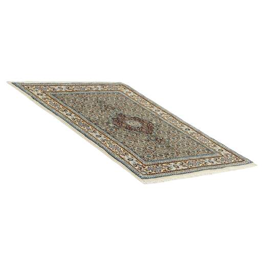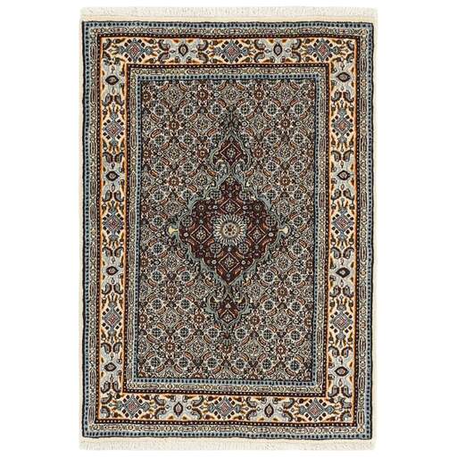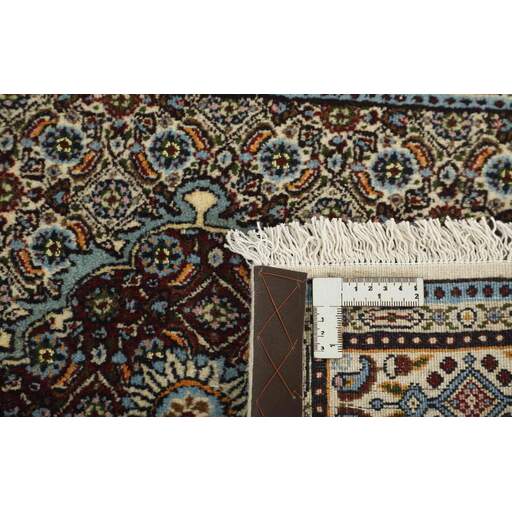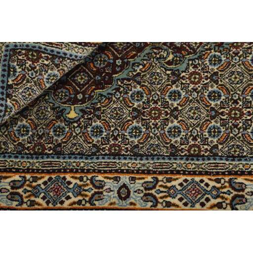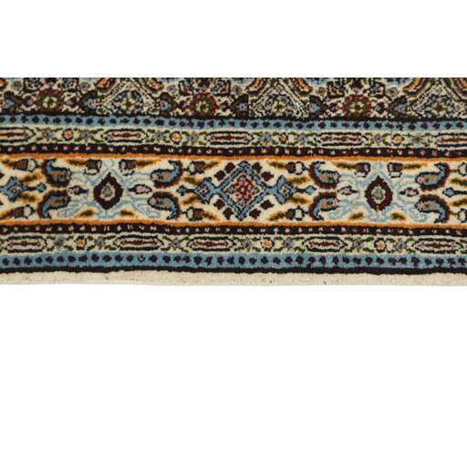 Moud is a small town south of Mashad, in the Khorrasan Province. Rugs from this area are characterised by homogeneity in patterns and quality. Warp and weft are cotton and the pile is wool. The trimmings are a version of the traditional Persian turtle trimming. The rugs are produced in all sizes. Moud rugs are often copied in India, because of their remarkable homogeneity. The characteristic Moud designs are among the most uniform, evenly knotted, and easily recognisable designs of the Khorrasan Province. Moud Mahi are made in a beige, light red, or blue tone, with all-over Mahi patterns or with a star shaped medallion. Mahi means fish, and the Mahi pattern is the most commonly used pattern in genuine Persian rugs. When looking at it closely, you can see a pond encircled by four fish.