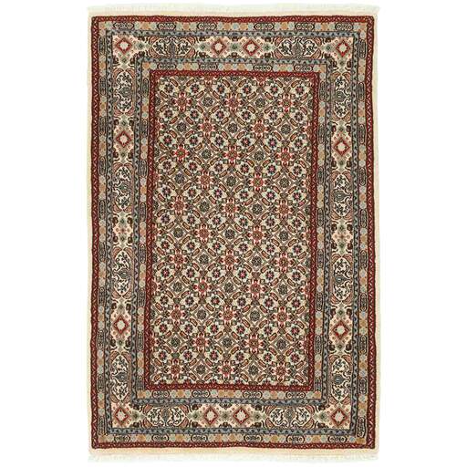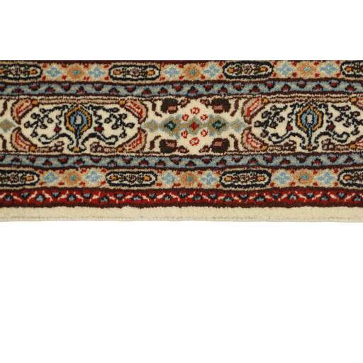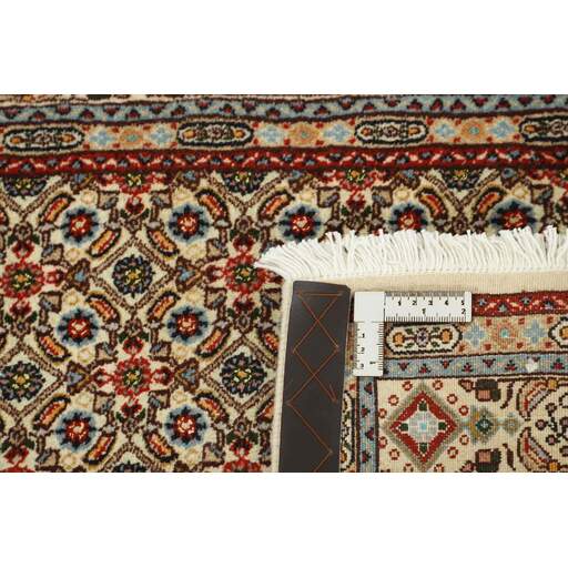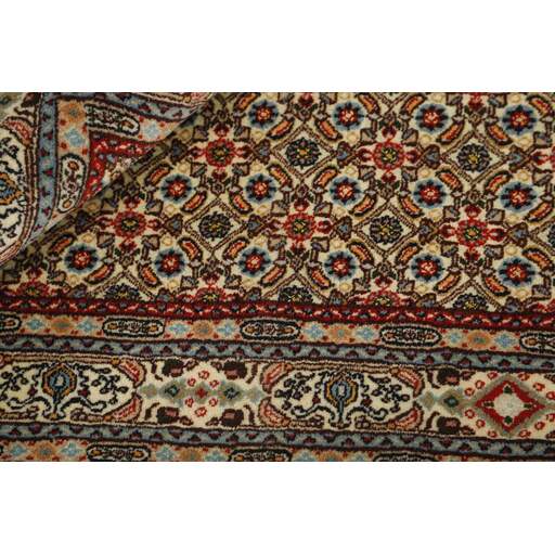 Moud is a small town south of Mashad, in the Khorrasan Province. Rugs from this area are characterised by homogeneity in patterns and quality. Warp and weft are cotton and the pile is wool. The trimmings are a version of the traditional Persian turtle trimming. The rugs are produced in all sizes. Moud rugs are often copied in India, because of their remarkable homogeneity. The characteristic Moud designs are among the most uniform, evenly knotted, and easily recognisable designs of the Khorrasan Province. Moud Mahi are made in a beige, light red, or blue tone, with all-over Mahi patterns or with a star shaped medallion. Mahi means fish, and the Mahi pattern is the most commonly used pattern in genuine Persian rugs. When looking at it closely, you can see a pond encircled by four fish.