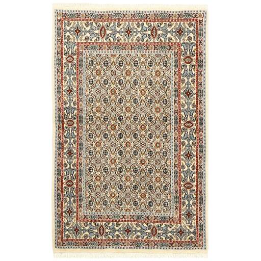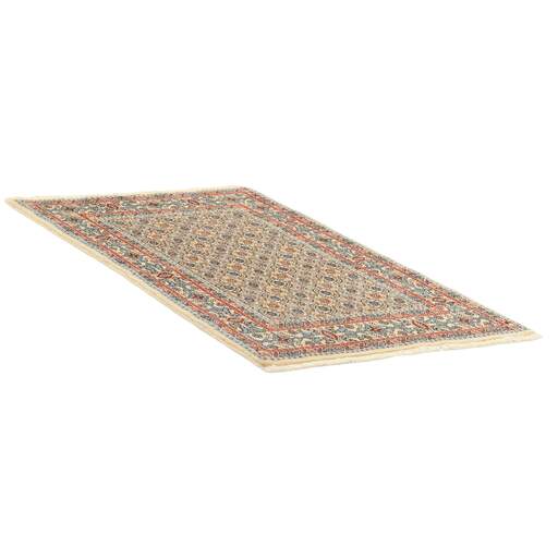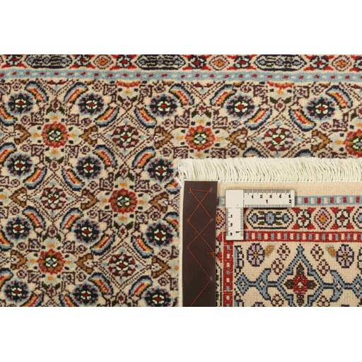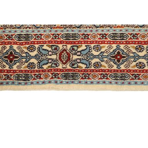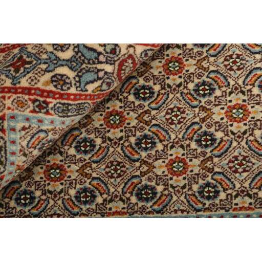 Moud is a small town south of Mashad, in the Khorrasan Province. Rugs from this area are characterised by homogeneity in patterns and quality. Warp and weft are cotton and the pile is wool. The trimmings are a version of the traditional Persian turtle trimming. The rugs are produced in all sizes. Moud rugs are often copied in India, because of their remarkable homogeneity. The characteristic Moud designs are among the most uniform, evenly knotted, and easily recognisable designs of the Khorrasan Province. Moud Mahi are made in a beige, light red, or blue tone, with all-over Mahi patterns or with a star shaped medallion. Mahi means fish, and the Mahi pattern is the most commonly used pattern in genuine Persian rugs. When looking at it closely, you can see a pond encircled by four fish.