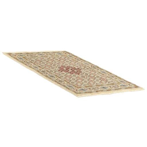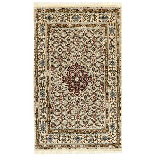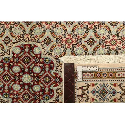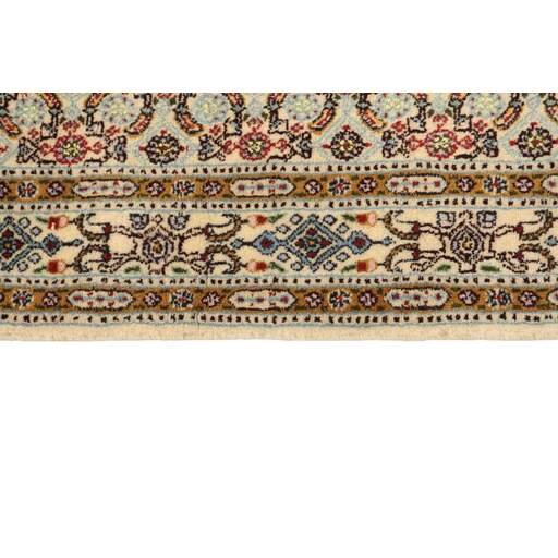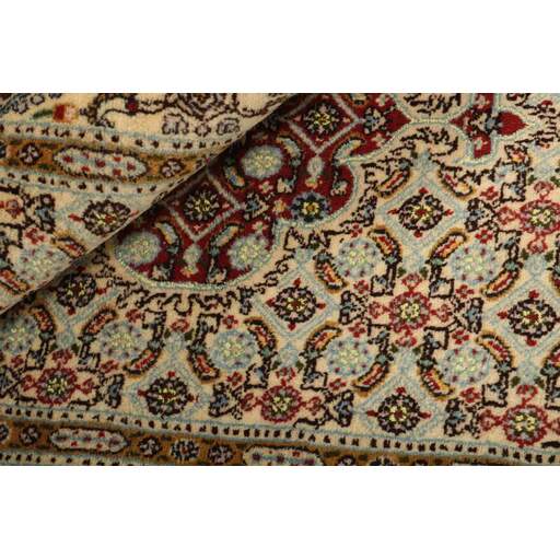 Moud is a small town south of Mashad, in the Khorrasan Province. Rugs from this area are characterised by homogeneity in patterns and quality. Warp and weft are cotton and the pile is wool. The trimmings are a version of the traditional Persian turtle trimming. The rugs are produced in all sizes. Moud rugs are often copied in India, because of their remarkable homogeneity. The characteristic Moud designs are among the most uniform, evenly knotted, and easily recognisable designs of the Khorrasan Province. Moud Mahi are made in a beige, light red, or blue tone, with all-over Mahi patterns or with a star shaped medallion. Mahi means fish, and the Mahi pattern is the most commonly used pattern in genuine Persian rugs. When looking at it closely, you can see a pond encircled by four fish.
