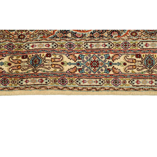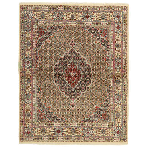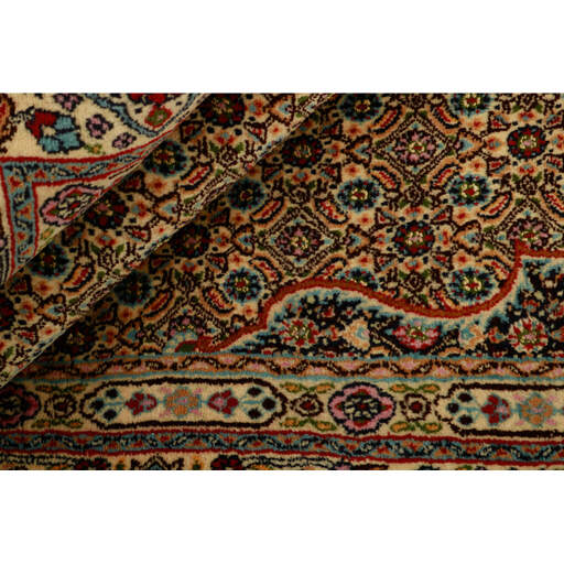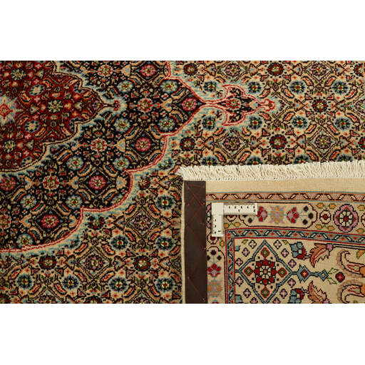 Moud is a small town south of Mashad, in the Khorrasan Province. Rugs from this area are characterised by homogeneity in patterns and quality. Warp and weft are cotton and the pile is wool. The trimmings are a version of the traditional Persian turtle trimming. The rugs are produced in all sizes. Moud rugs are often copied in India, because of their remarkable homogeneity. The characteristic Moud designs are among the most uniform, evenly knotted, and easily recognisable designs of the Khorrasan Province. Moud Mahi are made in a beige, light red, or blue tone, with all-over Mahi patterns or with a star shaped medallion. Mahi means fish, and the Mahi pattern is the most commonly used pattern in genuine Persian rugs. When looking at it closely, you can see a pond encircled by four fish.