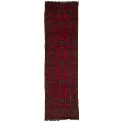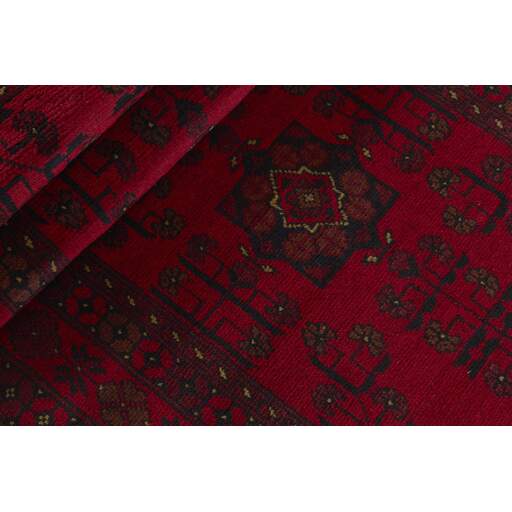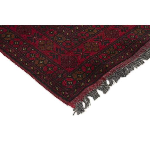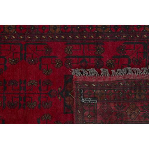 Two of the most popular Afghan rugs are Khal Mohammadi/Old Afghan, and Afghan Aktscha. Khal Mohammadi is handmade by Turkmens in northern Afghanistan. Both Turkmenistan to the North and Afghnaistan to the South are mostly inhabited by nomadic tribes. Kabul, the capitol of Afghanistan, and the city of Herat, are important centres for Afghan rugs. Characteristic of these rugs is the deep, warm, and fiery red base colour, the relatively high and sturdy pile, the wool base weave, the use of goat’s and horse’s hair, and knotting using the Seneh knot and the Gül (Elephant’s Foot) pattern. The base colour is a wide range of warm red nuances, from rust to copper brown. The pattern is a very dark blue, almost black, with ochre and ivory white colour.