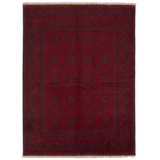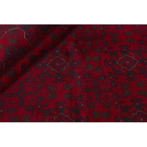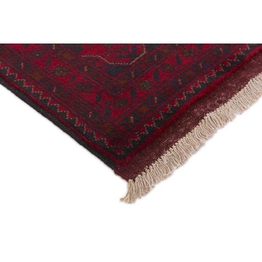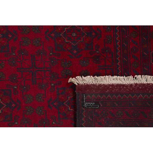 Two of the most popular Afghan rugs are Khal Mohammadi/Old Afghan, and Afghan Aktscha. Khal Mohammadi is handmade by Turkmens in northern Afghanistan. Both Turkmenistan to the North and Afghnaistan to the South are mostly inhabited by nomadic tribes. Kabul, the capitol of Afghanistan, and the city of Herat, are important centres for Afghan rugs. Characteristic of these rugs is the deep, warm, and fiery red base colour, the relatively high and sturdy pile, the wool base weave, the use of goat’s and horse’s hair, and knotting using the Seneh knot and the Gül (Elephant’s Foot) pattern. The base colour is a wide range of warm red nuances, from rust to copper brown. The pattern is a very dark blue, almost black, with ochre and ivory white colour.