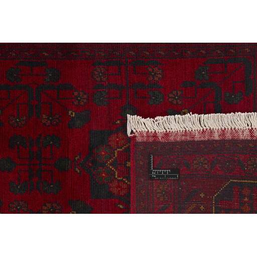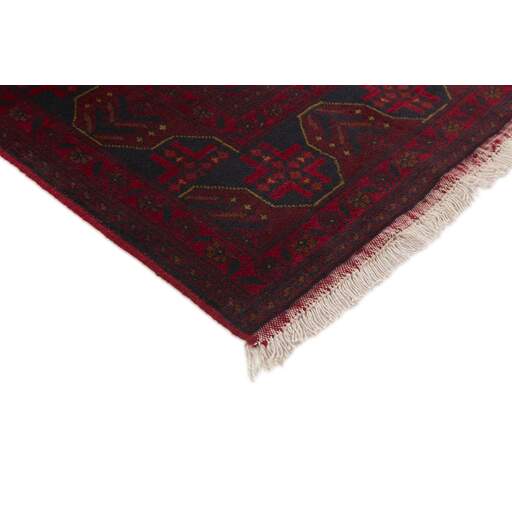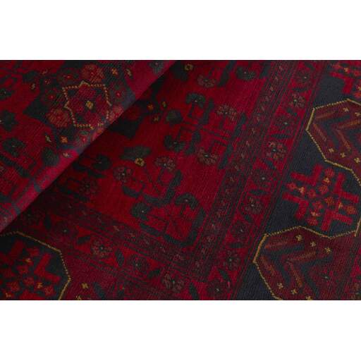 Two of the most popular Afghan rugs are Khal Mohammadi/Old Afghan, and Afghan Aktscha. Khal Mohammadi is handmade by Turkmens in northern Afghanistan. Both Turkmenistan to the North and Afghnaistan to the South are mostly inhabited by nomadic tribes. Kabul, the capitol of Afghanistan, and the city of Herat, are important centres for Afghan rugs. Characteristic of these rugs is the deep, warm, and fiery red base colour, the relatively high and sturdy pile, the wool base weave, the use of goat’s and horse’s hair, and knotting using the Seneh knot and the Gül (Elephant’s Foot) pattern. The base colour is a wide range of warm red nuances, from rust to copper brown. The pattern is a very dark blue, almost black, with ochre and ivory white colour.