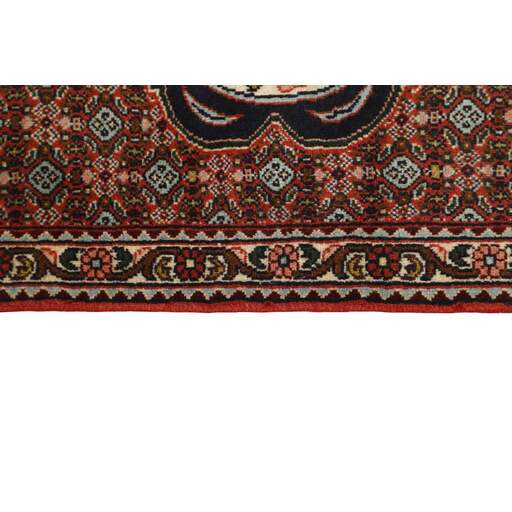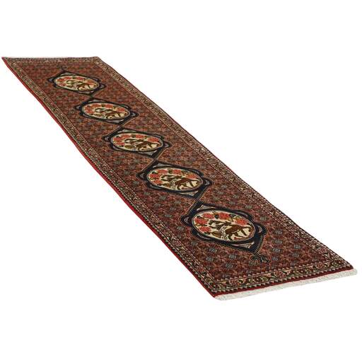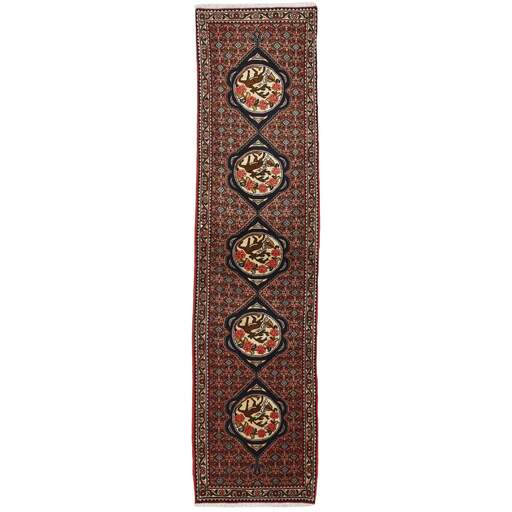 Seneh in Sanadaj is the capitol of the Kurdistan province of north-western Iran, and has about 300.000 inhabitants, most of them Kurds from the Gurani Tribe. Seneh rugs are easily recognisable by their knotting method, as well as the pattern colours and wool used. They usually have a simple weft, and the back of the rugs is often coarse and grainy, as the wool is spun tightly by hand before the knotting. Sometimes, a firm Bidjar-like knotting can be seen. Characteristically, the colours are deep blue, green, dark red, and white. Seneh wool is among the best qualities of wool in Iran: firm and durable, with a deep glow, a result of the high altitude, the sparse vegetation, and extremes in temperature. The tribal knotters in the area use the same type of wool. In the 19th century, Seneh rugs were famous for their fineness and the variation in patterns, while the modern production is less fine and not as varied. The Ghiordis knot is usually used, but you will also encounter rugs from Seneh with the Seneh knot. The typical Seneh rug has a Herati pattern field, with a series of geometrical medallions, one inside the other, each repeating the pattern with a different ground colour. Sometimes, the older, more uniform patterns are seen: Boteh, Vekili, Gol-Farang (naturalistic, European style bundles of flowers) or Gol-i-Bulbul (birds and flowers).