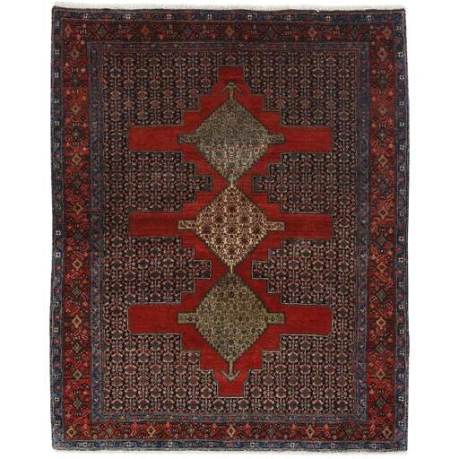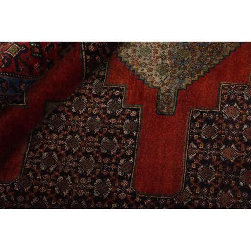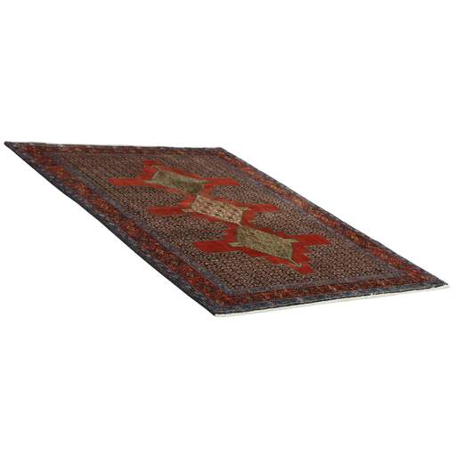Seneh in Sanadaj is the capitol of the Kurdistan province of north-western Iran, and has about 300.000 inhabitants, most of them Kurds from the Gurani Tribe. Seneh rugs are easily recognisable by their knotting method, as well as the pattern colours and wool used. They usually have a simple weft, and the back of the rugs is often coarse and grainy, as the wool is spun tightly by hand before the knotting. Sometimes, a firm Bidjar-like knotting can be seen. Characteristically, the colours are deep blue, green, dark red, and white. Seneh wool is among the best qualities of wool in Iran: firm and durable, with a deep glow, a result of the high altitude, the sparse vegetation, and extremes in temperature. The tribal knotters in the area use the same type of wool. In the 19th century, Seneh rugs were famous for their fineness and the variation in patterns, while the modern production is less fine and not as varied. The Ghiordis knot is usually used, but you will also encounter rugs from Seneh with the Seneh knot. The typical Seneh rug has a Herati pattern field, with a series of geometrical medallions, one inside the other, each repeating the pattern with a different ground colour. Sometimes, the older, more uniform patterns are seen: Boteh, Vekili, Gol-Farang (naturalistic, European style bundles of flowers) or Gol-i-Bulbul (birds and flowers).