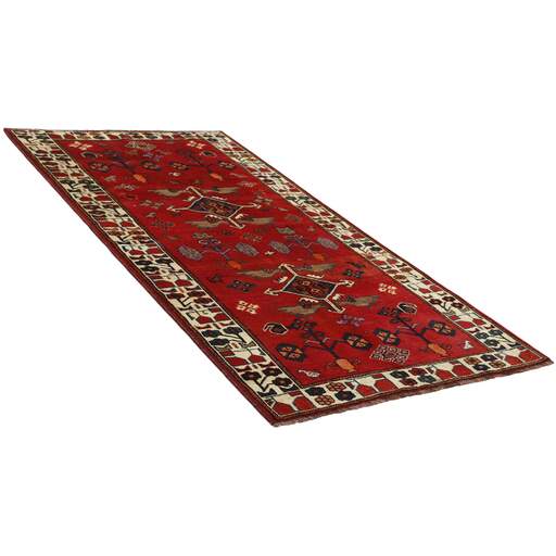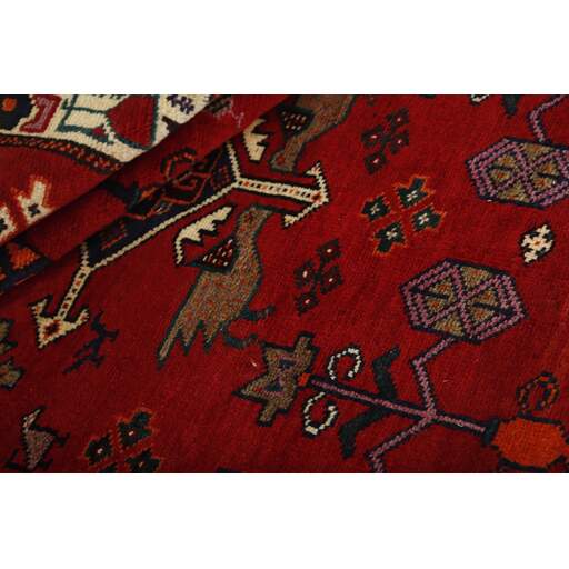 Shiraz, with a population of about one million, is the capitol of the south-eastern province of Fars, and is situated in the Zargros Mountains. Shiraz is an age-old city, which has been the capitol of Iran several times, and it is known as the city of roses and nightingales. It has a reputation of being very relaxed, with a “ we will get around to that tomorrow”-attitude. Shiraz has laid name to rugs that are knotted in the small towns and villages surrounding it, from where they are brought to the city to be sold. The local tribes like the Kashghai, whose best works are even finer and more densely knotted than those knotted in Shiraz itself, also make them. Shiraz rugs are characterised by a deep claret colour, combined with dark blue and small areas of white and green. The wool is soft, and darker wool, sometimes mixed with goat’s hair, is used for both warp and weft. The patterns are coarse and geometrical, often identical to the Kashghai patterns. Often, small, geometrical birds and animals brighten them up. Shiraz rugs are made in all sizes, although big rugs are rare.