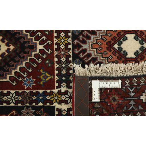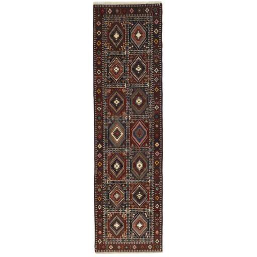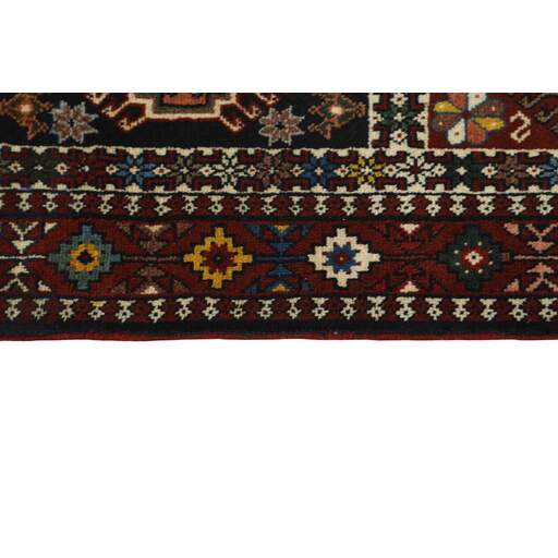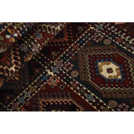 The colourful rugs from southern Iran have been named Yalameh, and are mainly knotted in and around the village of Aliabad in the Fars Province. Rugs of this origin were formerly called Shekarlu, but they were very rare. They were traditionally more colourful than other south Iranian rugs, the colours of which were limited to red and dark blue. In recent years, the supply of Shekarlu has been limited, but a new type of rug entered the market in the 60s and 70s; the Yalameh. These were just as colourful as the Shekarlu rugs, but with a stronger emphasis on blue. The knotting and the patterns are usually more uniform than with the Shekarlu rugs. They share many characteristics with the tribal rugs; they are 100% wool, and bright colours and geometrical patterns are generously used. Although the wool is characteristically soft and shining, it is machine spun, and the colours display a larger degree of variation than normal for tribal rugs, with soft nuances of red, pink, blue, green, and yellow. The motifs, however, are wholly traditional.