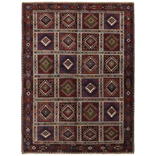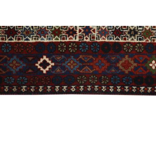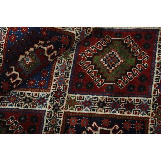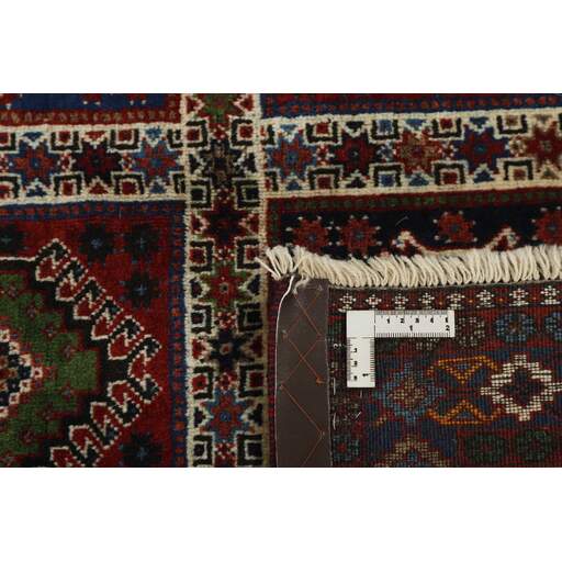 The colourful rugs from southern Iran have been named Yalameh, and are mainly knotted in and around the village of Aliabad in the Fars Province. Rugs of this origin were formerly called Shekarlu, but they were very rare. They were traditionally more colourful than other south Iranian rugs, the colours of which were limited to red and dark blue. In recent years, the supply of Shekarlu has been limited, but a new type of rug entered the market in the 60s and 70s; the Yalameh. These were just as colourful as the Shekarlu rugs, but with a stronger emphasis on blue. The knotting and the patterns are usually more uniform than with the Shekarlu rugs. They share many characteristics with the tribal rugs; they are 100% wool, and bright colours and geometrical patterns are generously used. Although the wool is characteristically soft and shining, it is machine spun, and the colours display a larger degree of variation than normal for tribal rugs, with soft nuances of red, pink, blue, green, and yellow. The motifs, however, are wholly traditional.