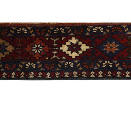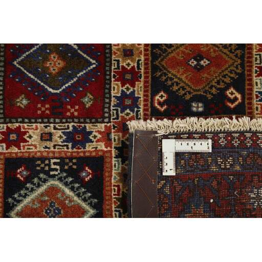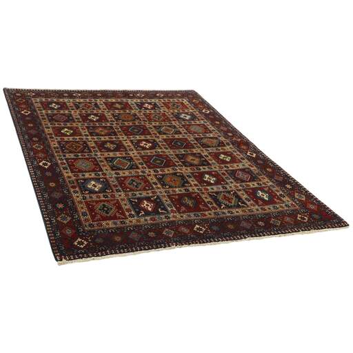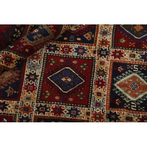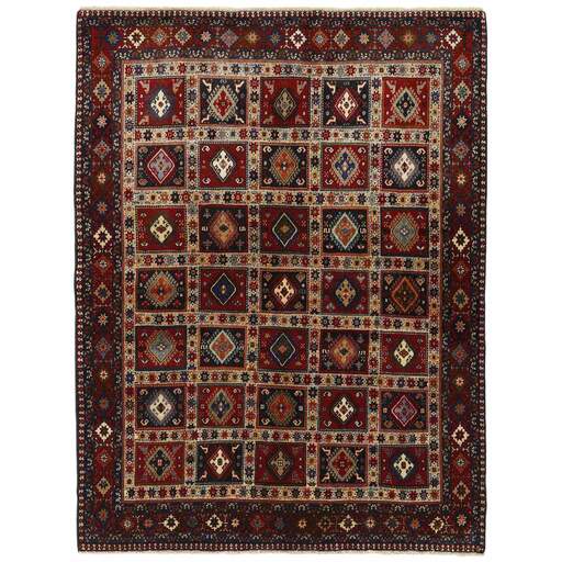 The colourful rugs from southern Iran have been named Yalameh, and are mainly knotted in and around the village of Aliabad in the Fars Province. Rugs of this origin were formerly called Shekarlu, but they were very rare. They were traditionally more colourful than other south Iranian rugs, the colours of which were limited to red and dark blue. In recent years, the supply of Shekarlu has been limited, but a new type of rug entered the market in the 60s and 70s; the Yalameh. These were just as colourful as the Shekarlu rugs, but with a stronger emphasis on blue. The knotting and the patterns are usually more uniform than with the Shekarlu rugs. They share many characteristics with the tribal rugs; they are 100% wool, and bright colours and geometrical patterns are generously used. Although the wool is characteristically soft and shining, it is machine spun, and the colours display a larger degree of variation than normal for tribal rugs, with soft nuances of red, pink, blue, green, and yellow. The motifs, however, are wholly traditional.