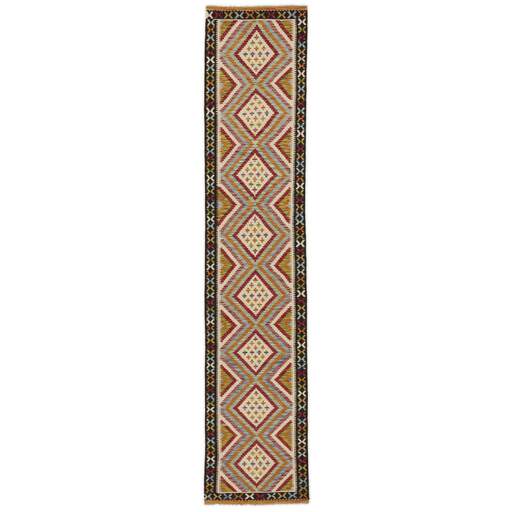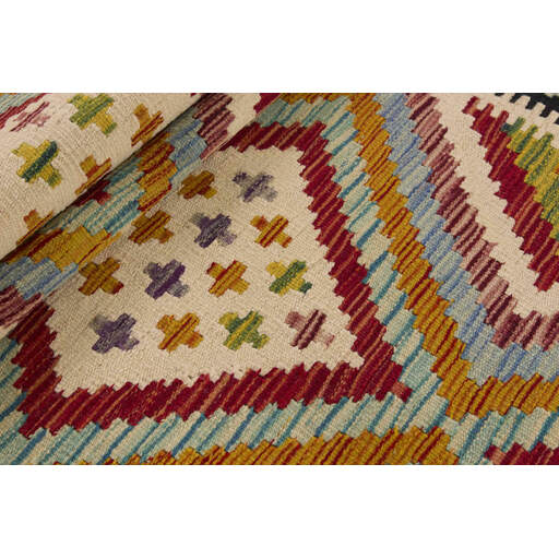 Afghan Kelim rugs are hand woven by Turkmens in northern Afghanistan. Kelim is the name of a common Persian weave, but also of the technology used in the production. Kelims are primarily produced by nomads and are pile-less rugs, which are also used for bags, as wall decoration, or as curtains for tents. A natural colour scale with geometrical symbols and octagons is used.