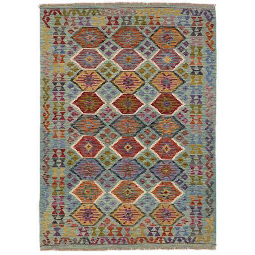 Afghan Kelim rugs are hand woven by Turkmens in northern Afghanistan. Kelim is the name of a common Persian weave, but also of the technology used in the production. Kelims are primarily produced by nomads and are pile-less rugs, which are also used for bags, as wall decoration, or as curtains for tents. A natural colour scale with geometrical symbols and octagons is used.