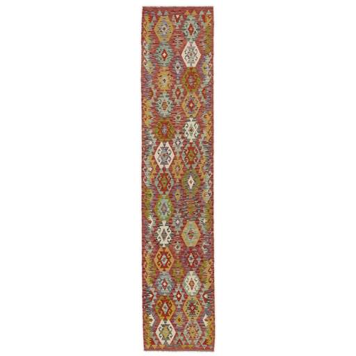 Afghan Kelim rugs are hand woven by Turkmens in northern Afghanistan. Kelim is the name of a common Persian weave, but also of the technology used in the production. Kelims are primarily produced by nomads and are pile-less rugs, which are also used for bags, as wall decoration, or as curtains for tents. A natural colour scale with geometrical symbols and octagons is used.