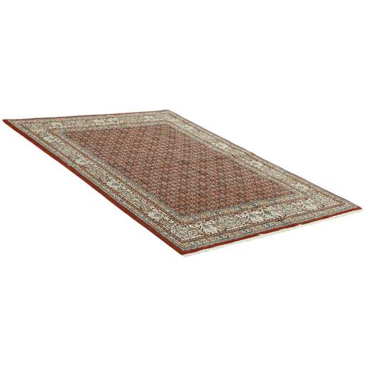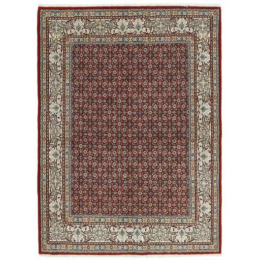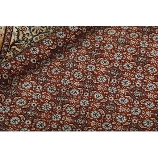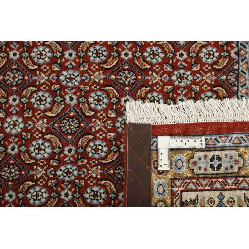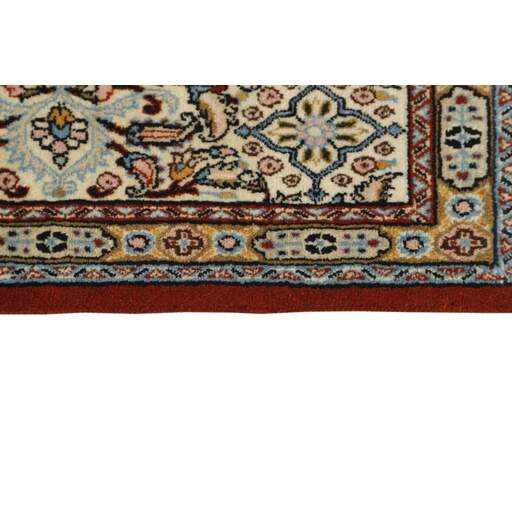 Moud est une petite ville au sud de Mashad, dans la province de Khorrasan. Les tapis de cette région se caractérisent par l'homogénéité de leurs motifs et de leur qualité. La chaîne et la trame sont en coton et le velours en laine. Les bordures sont une version de la bordure persane traditionnelle en tortue. Les tapis sont fabriqués dans toutes les tailles. Les tapis Moud sont souvent copiés en Inde, en raison de leur remarquable homogénéité. Les motifs caractéristiques de Moud sont parmi les plus uniformes, les plus réguliers et les plus facilement reconnaissables de la province de Khorrasan. Les Moud Mahi sont fabriqués dans des tons beige, rouge clair ou bleu, avec des motifs Mahi sur toute la surface ou avec un médaillon en forme d'étoile. Mahi signifie poisson et le motif Mahi est le motif le plus couramment utilisé dans les véritables tapis persans. En l'observant de près, vous pouvez voir un étang entouré de quatre poissons.