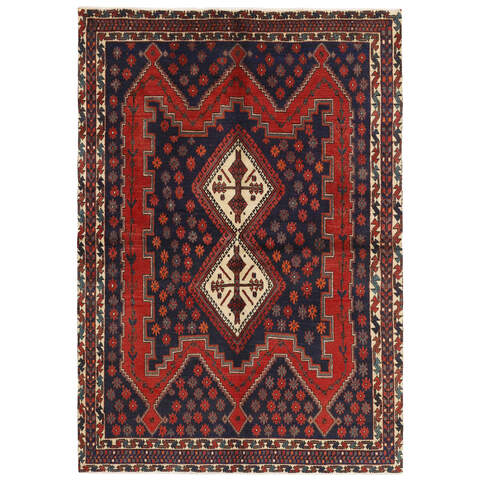 Les Afshar sont l'une des tribus nomades les plus importantes d'Iran. Le membre le plus célèbre de la tribu était Nadir Shah, un roi du 18e siècle qui a combattu une rébellion afghane pour vaincre Delhi et restituer le trône du Paon et d'autres trésors à l'Iran. De nos jours, les Afshar restent discrets et sont principalement célèbres pour leurs tapis. Ceux-ci sont classés selon les noms des villes où ils sont vendus. Les plus importants d'entre eux sont Shahr-e-Babak et Sirjan, qui sont situés à l'ouest/sud-ouest de Kerman, dans le sud-est de l'Iran. Sirjan était une ville très importante au 10e siècle, et on peut encore voir quelques ruines aujourd'hui. Tous les tapis Afshar ont un velours de laine, tandis que la chaîne et la trame sont généralement en coton. Les tapis Sirjan ont une densité moyenne et sont rigides et solidement noués. Les motifs sont simples ; un motif couvrant tout le tapis, ou de grands médaillons hexagonaux et trois médaillons en forme de losange dans un axe central. Le bleu profond et le rouge sont dominants. La plupart des tapis Sirjan ont la taille d'un grand Dozar. Les tapis Shahr-e-Babak sont plus fins et plus souples. Les motifs sont géométriques, très inventifs et souvent décorés d'animaux ou d'oiseaux. Une large gamme de couleurs est utilisée.