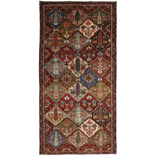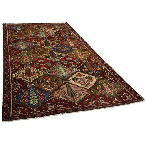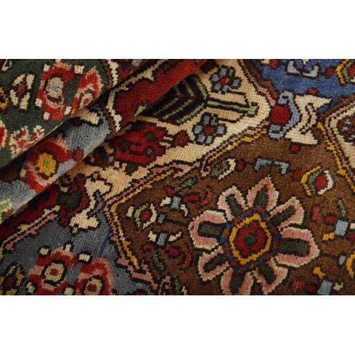 Bakhtiyar est le nom de deux types de tapis : l'un est produit par les nomades des montagnes du Zagros, à l'ouest d'Ispahan, dans le centre de l'Iran, et l'autre, plus important, est produit par les résidents permanents des villages de la région. Seuls quelques tapis nomades Bakhtiyar arrivent sur le marché - les plus courants sont probablement les tapis de sac qui combinent le travail du velours et du kelim. Les tapis des villages sont plus courants et sont produits dans de nombreux villages de montagne, dont les habitants sont d'origine turque, persane ou arménienne. Ils sont le plus souvent vendus dans les bazars d'Ispahan. Les motifs les plus courants sont les médaillons et les soi-disant motifs de jardin, qui sont divisés en carrés de différents motifs floraux. Le motif a des racines anciennes et est souvent rustique, car de grands blocs de couleur aux contours prononcés sont utilisés. La plupart des couleurs sont fabriquées à partir de pigments végétaux produits localement, ce qui donne un effet harmonieux aux tapis.