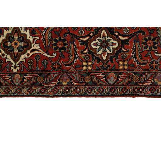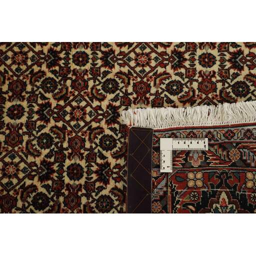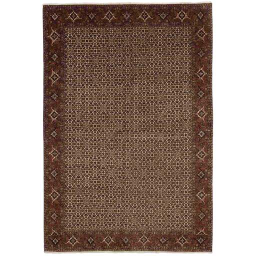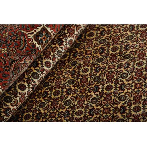 Bidjar est une ville d'environ 50 000 habitants située dans la province du Kurdistan, au nord-ouest du pays. Elle se trouve dans une vallée fertile entourée de montagnes arides et ne possède aucun monument important. La ville sert principalement de centre commercial pour les villages environnants. Son histoire récente est dramatique, car la ville a été occupée d'abord par les Russes, puis par les Turcs, pendant la Première Guerre mondiale, ce qui a entraîné une famine qui a considérablement réduit la population. Ces événements se reflètent dans la production de tapis de la ville. Avant la Première Guerre mondiale, les tapis étaient noués grossièrement mais fermement, avec une chaîne et une trame en laine. Plus tard, ils sont devenus plus fins et avaient des bases en coton. Les motifs Bidjar sont souvent Herati, mais parfois on peut voir un motif Mahi. Les couleurs sont généralement des rouges clairs avec une bordure légère. Les tapis Bidjar sont si fortement noués que vous risquez de casser les nœuds si vous les pliez ensemble avec le poil tourné vers l'intérieur. Lorsque vous pliez les tapis Bidjar, c'est donc toujours avec le poil tourné vers l'extérieur. On sent clairement que la laine utilisée dans un tapis Bidjar est bien plus importante que dans la plupart des autres tapis. Ils sont beaucoup plus lourds et ne sont pas aussi faciles à déplacer lorsqu'ils sont posés sur le sol.