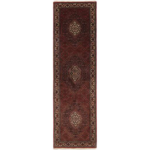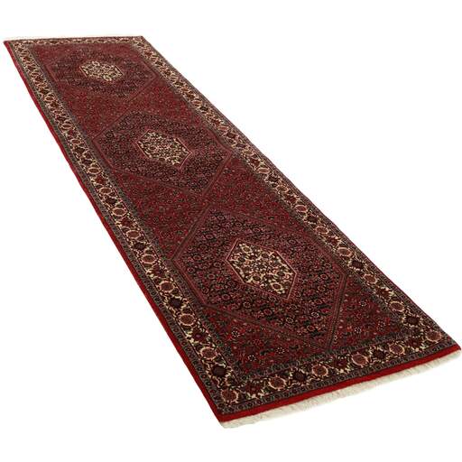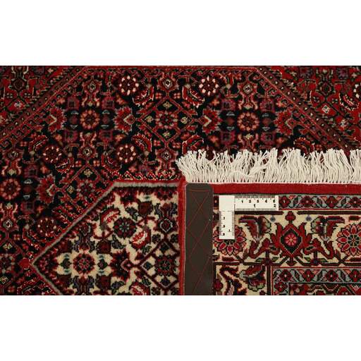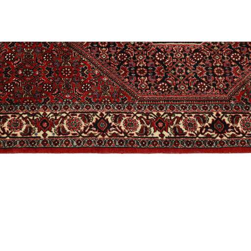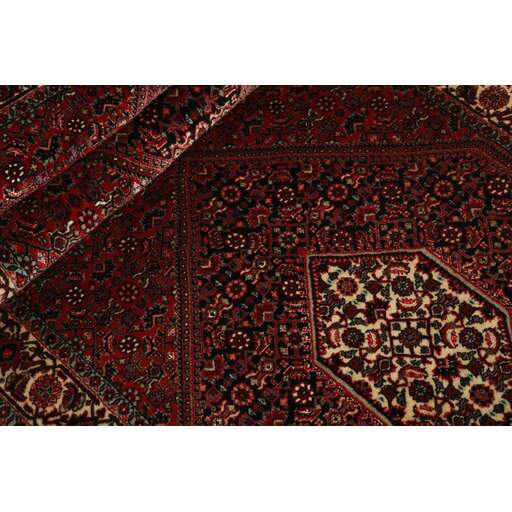 Bidjar est une ville d'environ 50 000 habitants située dans la province du Kurdistan, au nord-ouest du pays. Elle se trouve dans une vallée fertile entourée de montagnes arides et ne possède aucun monument important. La ville sert principalement de centre commercial pour les villages environnants. Son histoire récente est dramatique, car la ville a été occupée d'abord par les Russes, puis par les Turcs, pendant la Première Guerre mondiale, ce qui a entraîné une famine qui a considérablement réduit la population. Ces événements se reflètent dans la production de tapis de la ville. Avant la Première Guerre mondiale, les tapis étaient noués grossièrement mais fermement, avec une chaîne et une trame en laine. Plus tard, ils sont devenus plus fins et avaient des bases en coton. Les motifs Bidjar sont souvent Herati, mais parfois on peut voir un motif Mahi. Les couleurs sont généralement des rouges clairs avec une bordure légère. Les tapis Bidjar sont si fortement noués que vous risquez de casser les nœuds si vous les pliez ensemble avec le poil tourné vers l'intérieur. Lorsque vous pliez les tapis Bidjar, c'est donc toujours avec le poil tourné vers l'extérieur. On sent clairement que la laine utilisée dans un tapis Bidjar est bien plus importante que dans la plupart des autres tapis. Ils sont beaucoup plus lourds et ne sont pas aussi faciles à déplacer lorsqu'ils sont posés sur le sol.