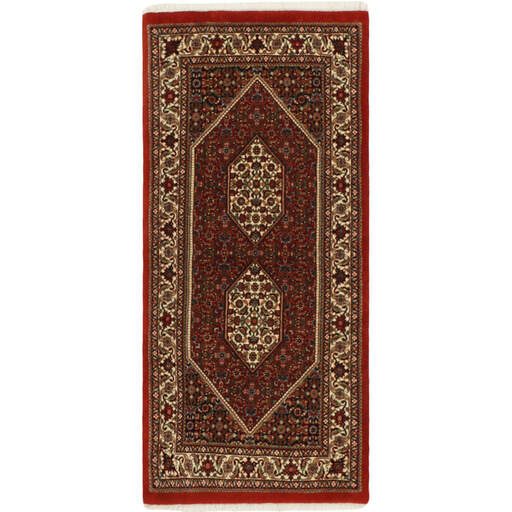 Bidjar est une ville d'environ 50 000 habitants située dans la province du Kurdistan, au nord-ouest du pays. Elle se trouve dans une vallée fertile entourée de montagnes arides et ne possède aucun monument important. La ville sert principalement de centre commercial pour les villages environnants. Son histoire récente est dramatique, car la ville a été occupée d'abord par les Russes, puis par les Turcs, pendant la Première Guerre mondiale, ce qui a entraîné une famine qui a considérablement réduit la population. Ces événements se reflètent dans la production de tapis de la ville. Avant la Première Guerre mondiale, les tapis étaient noués grossièrement mais fermement, avec une chaîne et une trame en laine. Plus tard, ils sont devenus plus fins et avaient des bases en coton. Les motifs Bidjar sont souvent Herati, mais parfois on peut voir un motif Mahi. Les couleurs sont généralement des rouges clairs avec une bordure légère. Les tapis Bidjar sont si fortement noués que vous risquez de casser les nœuds si vous les pliez ensemble avec le poil tourné vers l'intérieur. Lorsque vous pliez les tapis Bidjar, c'est donc toujours avec le poil tourné vers l'extérieur. On sent clairement que la laine utilisée dans un tapis Bidjar est bien plus importante que dans la plupart des autres tapis. Ils sont beaucoup plus lourds et ne sont pas aussi faciles à déplacer lorsqu'ils sont posés sur le sol.