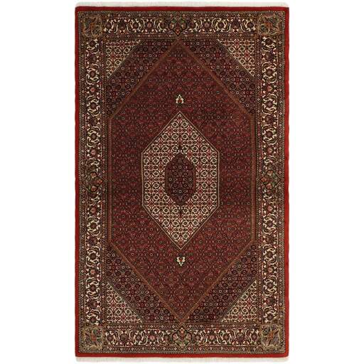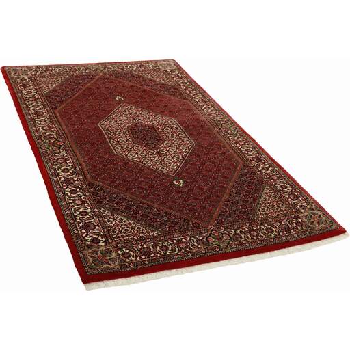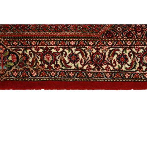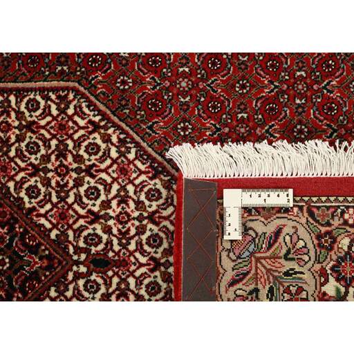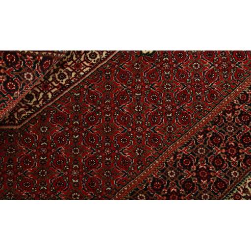 Bidjar est une ville d'environ 50 000 habitants située dans la province du Kurdistan, au nord-ouest du pays. Elle se trouve dans une vallée fertile entourée de montagnes arides et ne possède aucun monument important. La ville sert principalement de centre commercial pour les villages environnants. Son histoire récente est dramatique, car la ville a été occupée d'abord par les Russes, puis par les Turcs, pendant la Première Guerre mondiale, ce qui a entraîné une famine qui a considérablement réduit la population. Ces événements se reflètent dans la production de tapis de la ville. Avant la Première Guerre mondiale, les tapis étaient noués grossièrement mais fermement, avec une chaîne et une trame en laine. Plus tard, ils sont devenus plus fins et avaient des bases en coton. Les motifs Bidjar sont souvent Herati, mais parfois on peut voir un motif Mahi. Les couleurs sont généralement des rouges clairs avec une bordure légère. Les tapis Bidjar sont si fortement noués que vous risquez de casser les nœuds si vous les pliez ensemble avec le poil tourné vers l'intérieur. Lorsque vous pliez les tapis Bidjar, c'est donc toujours avec le poil tourné vers l'extérieur. On sent clairement que la laine utilisée dans un tapis Bidjar est bien plus importante que dans la plupart des autres tapis. Ils sont beaucoup plus lourds et ne sont pas aussi faciles à déplacer lorsqu'ils sont posés sur le sol.