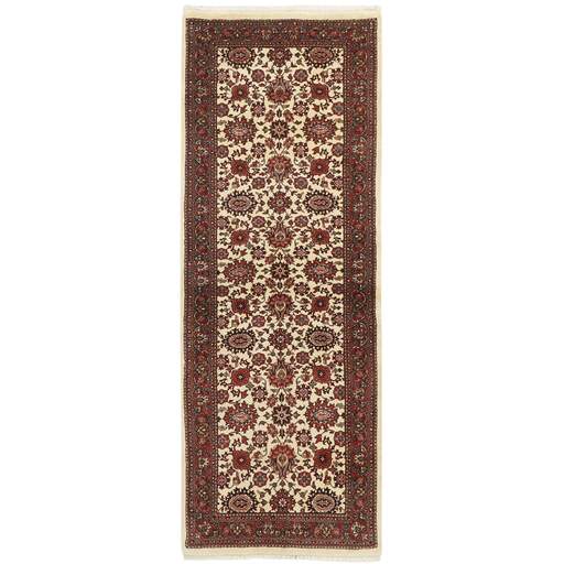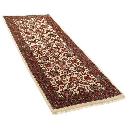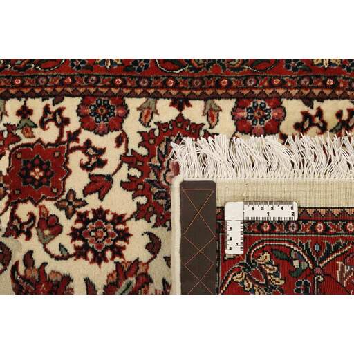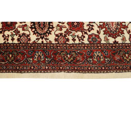 Bidjar est une ville d'environ 50 000 habitants située dans la province du Kurdistan, au nord-ouest du pays. Elle se trouve dans une vallée fertile entourée de montagnes arides et ne possède aucun monument important. La ville sert principalement de centre commercial pour les villages environnants. Son histoire récente est dramatique, car la ville a été occupée d'abord par les Russes, puis par les Turcs, pendant la Première Guerre mondiale, ce qui a entraîné une famine qui a considérablement réduit la population. Ces événements se reflètent dans la production de tapis de la ville. Avant la Première Guerre mondiale, les tapis étaient noués grossièrement mais fermement, avec une chaîne et une trame en laine. Plus tard, ils sont devenus plus fins et avaient des bases en coton. Les motifs Bidjar sont souvent Herati, mais parfois on peut voir un motif Mahi. Les couleurs sont généralement des rouges clairs avec une bordure légère. Les tapis Bidjar sont si fortement noués que vous risquez de casser les nœuds si vous les pliez ensemble avec le poil tourné vers l'intérieur. Lorsque vous pliez les tapis Bidjar, c'est donc toujours avec le poil tourné vers l'extérieur. On sent clairement que la laine utilisée dans un tapis Bidjar est bien plus importante que dans la plupart des autres tapis. Ils sont beaucoup plus lourds et ne sont pas aussi faciles à déplacer lorsqu'ils sont posés sur le sol.