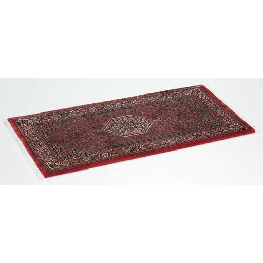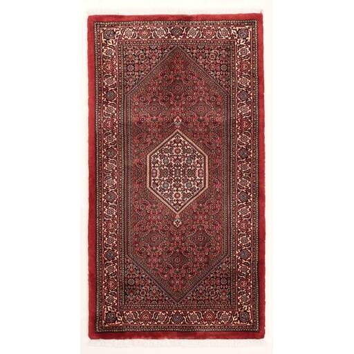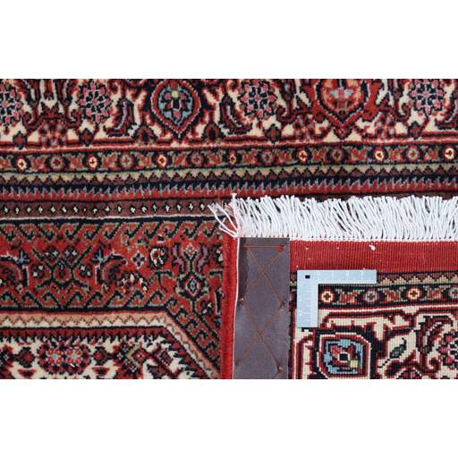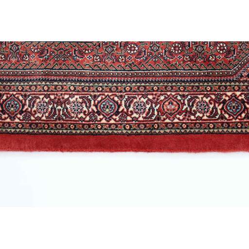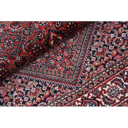 Bidjar est une ville d'environ 50 000 habitants située dans la province du Kurdistan, au nord-ouest du pays. Elle se trouve dans une vallée fertile entourée de montagnes arides et ne possède aucun monument important. La ville sert principalement de centre commercial pour les villages environnants. Son histoire récente est dramatique, car la ville a été occupée d'abord par les Russes, puis par les Turcs, pendant la Première Guerre mondiale, ce qui a entraîné une famine qui a considérablement réduit la population. Ces événements se reflètent dans la production de tapis de la ville. Avant la Première Guerre mondiale, les tapis étaient noués grossièrement mais fermement, avec une chaîne et une trame en laine. Plus tard, ils sont devenus plus fins et avaient des bases en coton. Les motifs Bidjar sont souvent Herati, mais parfois on peut voir un motif Mahi. Les couleurs sont généralement des rouges clairs avec une bordure légère. Les tapis Bidjar sont si fortement noués que vous risquez de casser les nœuds si vous les pliez ensemble avec le poil tourné vers l'intérieur. Lorsque vous pliez les tapis Bidjar, c'est donc toujours avec le poil tourné vers l'extérieur. On sent clairement que la laine utilisée dans un tapis Bidjar est bien plus importante que dans la plupart des autres tapis. Ils sont beaucoup plus lourds et ne sont pas aussi faciles à déplacer lorsqu'ils sont posés sur le sol.