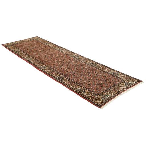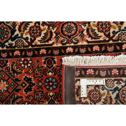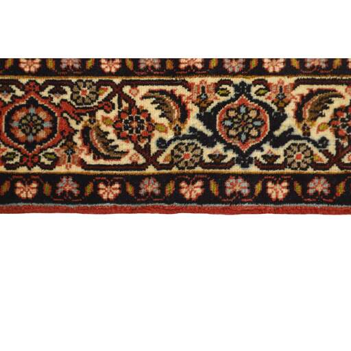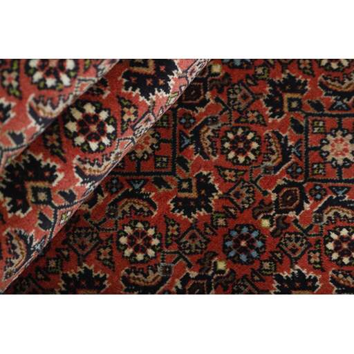 Bidjar est une ville d'environ 50 000 habitants située dans la province du Kurdistan, au nord-ouest du pays. Elle se trouve dans une vallée fertile entourée de montagnes arides et ne possède aucun monument important. La ville sert principalement de centre commercial pour les villages environnants. Son histoire récente est dramatique, car la ville a été occupée d'abord par les Russes, puis par les Turcs, pendant la Première Guerre mondiale, ce qui a entraîné une famine qui a considérablement réduit la population. Ces événements se reflètent dans la production de tapis de la ville. Avant la Première Guerre mondiale, les tapis étaient noués grossièrement mais fermement, avec une chaîne et une trame en laine. Plus tard, ils sont devenus plus fins et avaient des bases en coton. Les motifs Bidjar sont souvent Herati, mais parfois on peut voir un motif Mahi. Les couleurs sont généralement des rouges clairs avec une bordure légère. Les tapis Bidjar sont si fortement noués que vous risquez de casser les nœuds si vous les pliez ensemble avec le poil tourné vers l'intérieur. Lorsque vous pliez les tapis Bidjar, c'est donc toujours avec le poil tourné vers l'extérieur. On sent clairement que la laine utilisée dans un tapis Bidjar est bien plus importante que dans la plupart des autres tapis. Ils sont beaucoup plus lourds et ne sont pas aussi faciles à déplacer lorsqu'ils sont posés sur le sol.