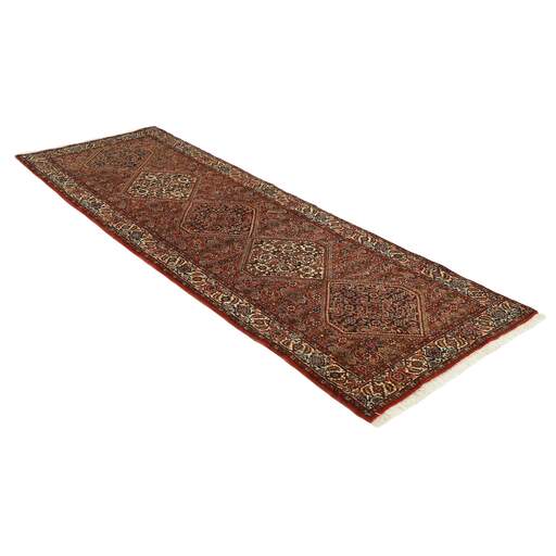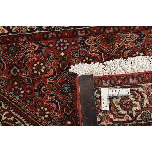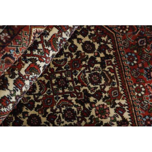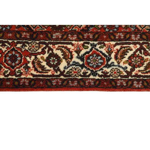 Bidjar est une ville d'environ 50 000 habitants située dans la province du Kurdistan, au nord-ouest du pays. Elle se trouve dans une vallée fertile entourée de montagnes arides et ne possède aucun monument important. La ville sert principalement de centre commercial pour les villages environnants. Son histoire récente est dramatique, car la ville a été occupée d'abord par les Russes, puis par les Turcs, pendant la Première Guerre mondiale, ce qui a entraîné une famine qui a considérablement réduit la population. Ces événements se reflètent dans la production de tapis de la ville. Avant la Première Guerre mondiale, les tapis étaient noués grossièrement mais fermement, avec une chaîne et une trame en laine. Plus tard, ils sont devenus plus fins et avaient des bases en coton. Les motifs Bidjar sont souvent Herati, mais parfois on peut voir un motif Mahi. Les couleurs sont généralement des rouges clairs avec une bordure légère. Les tapis Bidjar sont si fortement noués que vous risquez de casser les nœuds si vous les pliez ensemble avec le poil tourné vers l'intérieur. Lorsque vous pliez les tapis Bidjar, c'est donc toujours avec le poil tourné vers l'extérieur. On sent clairement que la laine utilisée dans un tapis Bidjar est bien plus importante que dans la plupart des autres tapis. Ils sont beaucoup plus lourds et ne sont pas aussi faciles à déplacer lorsqu'ils sont posés sur le sol.